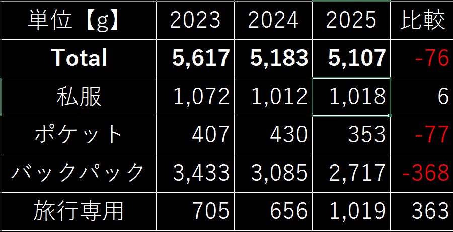 逆に旅行用が増えたことで削減効果が薄れて見えるが、旅行なんて滅多にしないからトータルで見れば重量以上の快適さがある。