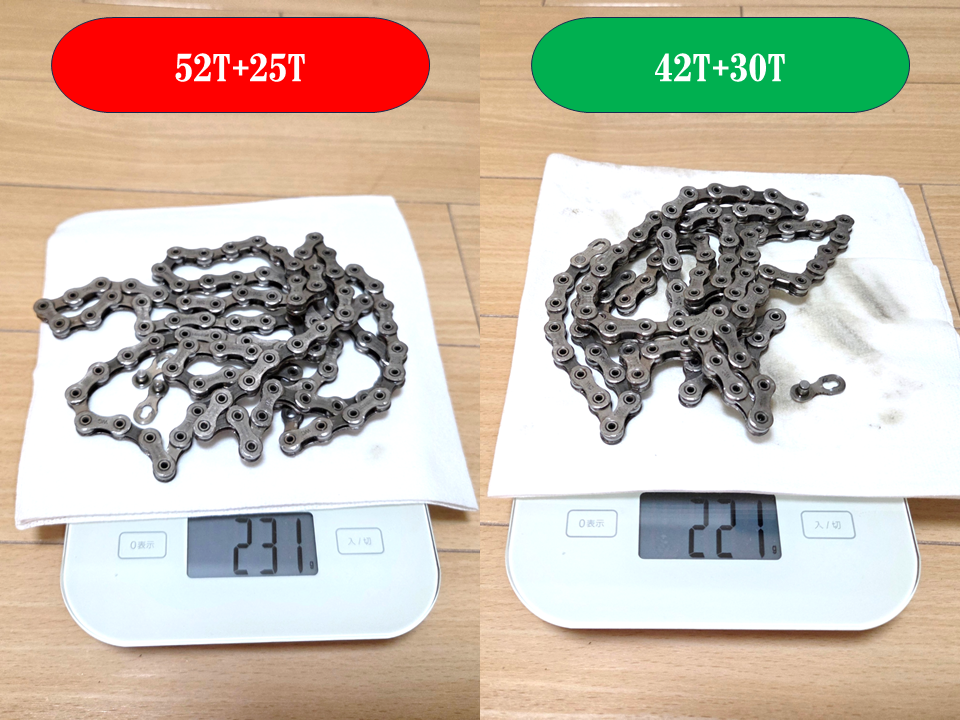 ちなみにチェーン長はフロントとリアの最大歯数で算出するんだけど、前回が52T+25T=77Tに対して今回は42T+30T=72Tで差分の5リンクが短くなる計算。