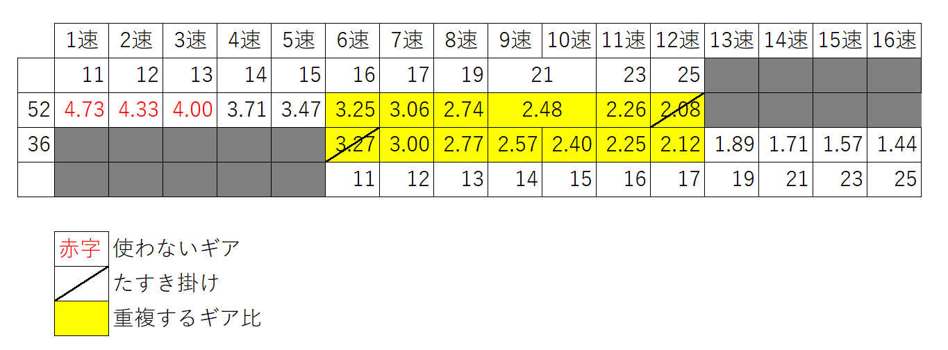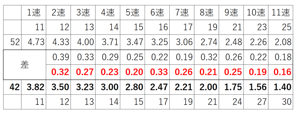 11-25Tに比べて歯数の飛びが大きくなるが、フロントが「52T→42T」と小さくなったからギア比の変化幅を抑えることができた↓